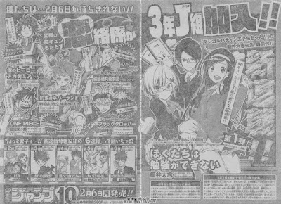 Bokutachi wa Benkyō ga Dekinai (We Can’t Study) por Taishi TsutsuiO mangá será lançado na 10ª edição do Weekly Shonen Jump em 6 de fevereiro, e o primeiro capítulo terá 54 páginas e uma página colorida de abertura. O mangá se concentra em Yuiga, um estudante que estuda para seus exames de vestibular. Um dia, duas jovens belas aparecem diante dele. Tsutsui está desenhando o mangá spinoff de Nisekoi, Magical Pâtissier Kosaki-chan.