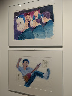 Uma parede inteira foi reservada para diversos quadros coloridos (aquarelas?) de todas as obras do Urasawa.