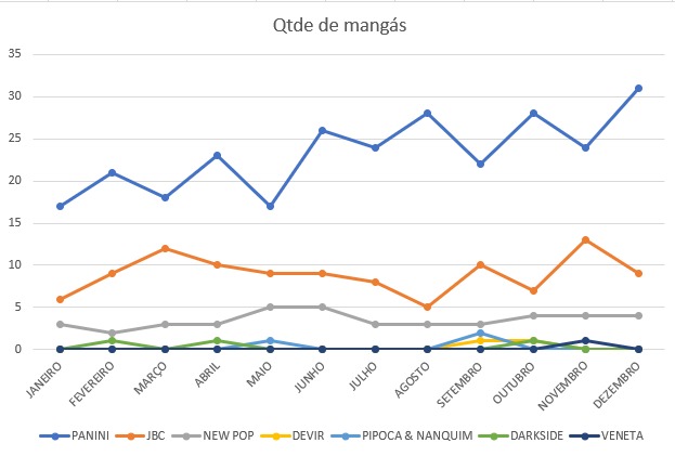 Começamos 2019 com 26 mangás e terminamos com 44. Depois de julho, o gráfico só mostrou o crescimento nas publicações. Atingimos o ápice em dezembro.