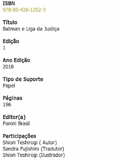 Hoje (15 de junho de 2018) vazaram mais títulos da Editora Panini (Planet Mangá) pelo ISBN. Além de Dragon Ball Super e Boruto, também vem Batman e Liga da Justiça, mangá desenhado por Shiori Teshirogi (criadora de Saint Seiya The Lost Canvas) publicado na revista Champion Red da Editora Akita Shoten desde junho, com 2 volumes já lançados. DC Comics é creditada como co-criador e supervisor.
