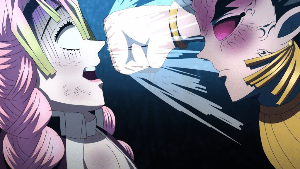- Destaques: A luta combina agilidade, força física e técnicas únicas de Mitsuri. Além disso, a animação mostra detalhes de movimento e cor que a tornam visualmente espetacular.