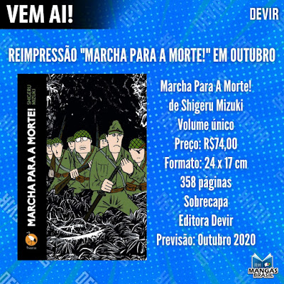 Sinopse: No final da Segunda Grande Guerra, os soldados de uma compa-nhia da infantaria japonesa são ordenados a morrer em nome do seu país ou serão executados ao regressar da batalha. Marcha para a Morte!, baseado em fatos reais e na experiência do autor quando serviu no Exército, relata as consequências devastado-ras deste episódio para o moral dos soldados.A narrativa poderosa e pungente traduz de forma sensível as cir-cunstâncias difíceis e caóticas, em uma declaração de Mizuki contra a futilidade da guerra e a estupidez da mentalidade militar.Vencedor do Prêmio de Legado do Festival Internacional de Qua-drinhos de Angoulême, 2009, e do Prêmio Eisner de Melhor Edição Americana de Material Internacional do Japão e de Melhor Trabalho Baseado em Fatos Reais, 2012.Onde comprar: http://compre.vc/v2/2630ea0eba9