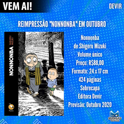 Sinopse: NonNonBa, publicado originalmente no Japão em 1977, é a obraprima de Shigeru Mizuki, um dos autores de mangá mais importantes de todos os tempos. Parte biográfico, parte fantástico, NonNonBa é um trabalho tocante sobre a infância e o amadurecimento, inspirado em grande parte no próprio Mizuki, quando criança, e sua avó, uma fonte inesgotável de conhecimento sobre os youkais (espíritos-monstros do folclore japonês). Neste mangá, os personagens caricatos e expressivos contrastam com cenários detalhados e realistas, resultando em um trabalho ímpar que é, ao mesmo tempo, delicado e expressivo. NonNonBa está firmemente enraizado em um contexto social e histórico, e passeia pelo mundo sobrenatural. Em 2007, NonNonBa foi o primeiro mangá vencedor na categoria de Melhor Álbum do Festival de Angoulême. E, em 2013, foi indicado ao Prêmio Eisner de Melhor Edição Norte-Americana de Material Estrangeiro (Asiático).Onde comprar: http://compre.vc/v2/2635c97e091