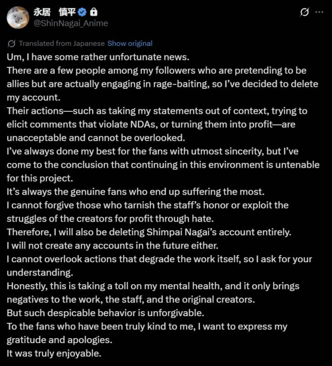 À medida que os comentários negativos se multiplicavam, Shinpei Nagai passou a ser diretamente responsabilizado por muitos fãs. A pressão foi tanta que o diretor optou por encerrar sua conta nas redes sociais, alegando que o ambiente se tornou insustentável. Em sua despedida, ele destacou o impacto emocional da situação e agradeceu aos fãs que permaneceram respeitosos e apoiadores.
