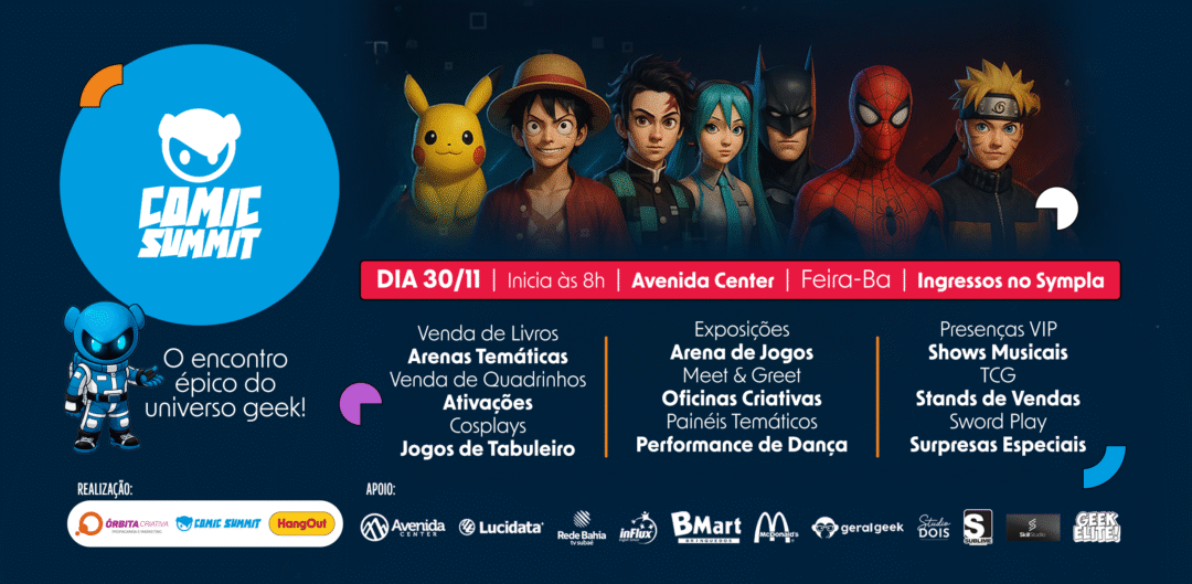 Feira de Santana recebe a segunda edição do Comic Summit em 30 de novembro de 2025, com programação dedicada a quadrinhos, cultura pop, criatividade e inovação. O evento acontece no Avenida Center e promete consolidar o interior baiano como polo geek e cultural.