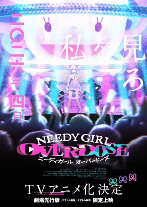 A franquia indie Needy Girl Overdose, conhecida por sua abordagem ousada sobre cultura digital, ansiedade e obsessão por validação online, será adaptada para anime em abril de 2026. A produção será do estúdio Yostar Pictures, com direção de Masaoki Nakajima, responsável por trabalhos como BNA e Kantai Collection.
