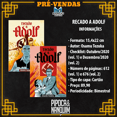 “O Deus do Mangá Osamu Tezuka, um dos maiores artistas do século XX, se debruça sobre um dos episódios mais infames da humanidade, a ascensão do Partido Nazista e a Segunda Guerra Mundial, e nos entrega um dos melhores trabalhos de sua carreira, que mistura os gêneros policial, espionagem e aventura em uma história fascinante. O mangá Adolf ni Tsugu está de volta ao Brasil, dessa vez em uma coleção de dois grandes volumes e com seu título original: Recado a Adolf. Nesta história nós acompanhamos a vida de três Adolfs. O primeiro deles é filho de um oficial nazista do consulado da Alemanha no Japão. O outro é um japonês filho de imigrantes judeus. E o terceiro é… Adolf Hitler. Três pessoas completamente distintas, com apenas o nome em comum, cujos destinos estão entrelaçados com o de um repórter japonês chamado Souhei Touge, detentor de um valioso documento que guarda um grave segredo sobre Hitler. Um segredo que, se revelado, colocará fim à marcha dos nazistas e destruirá o pior Adolf que o mundo já conheceu. Produzido nos anos 1980, esse é um dos mangás mais adultos de Osamu Tezuka e um dos últimos de sua impressionante carreira, feito no estilo realista dos gekigás. As duas edições da editora Pipoca & Nanquim têm mais de 600 páginas cada e trazem a história completa, com capa cartão e sobrecapa com verniz de alto relevo, miolo colado e costurado para o melhor manuseio na leitura, papel polén bold de alta gramatura, com glossários exclusivos da versão brasileira e biografia do autor.”