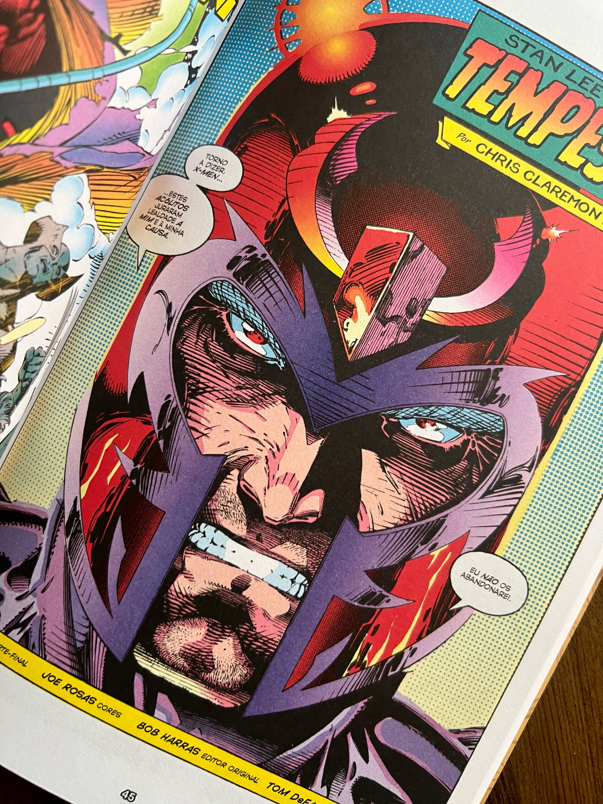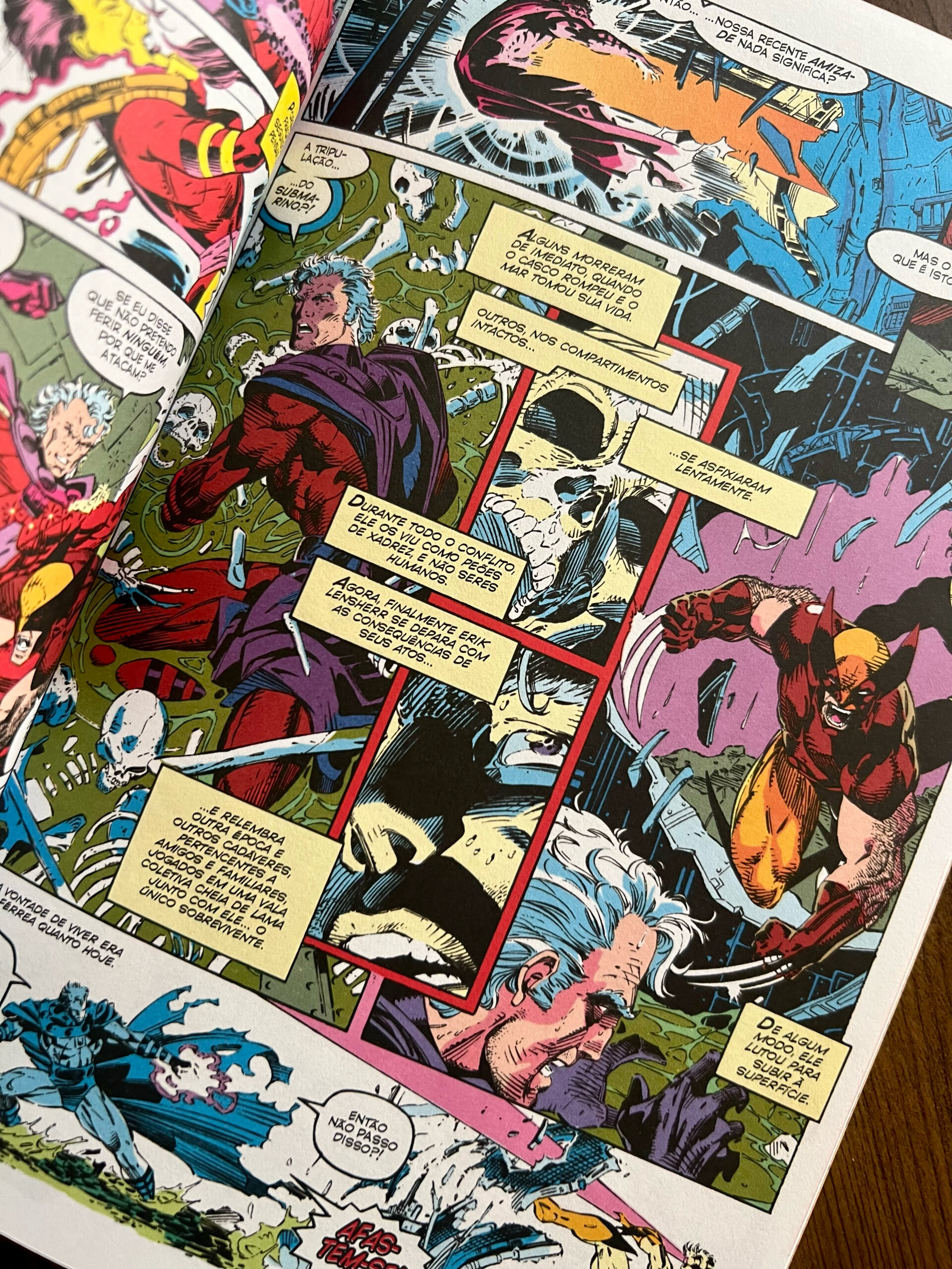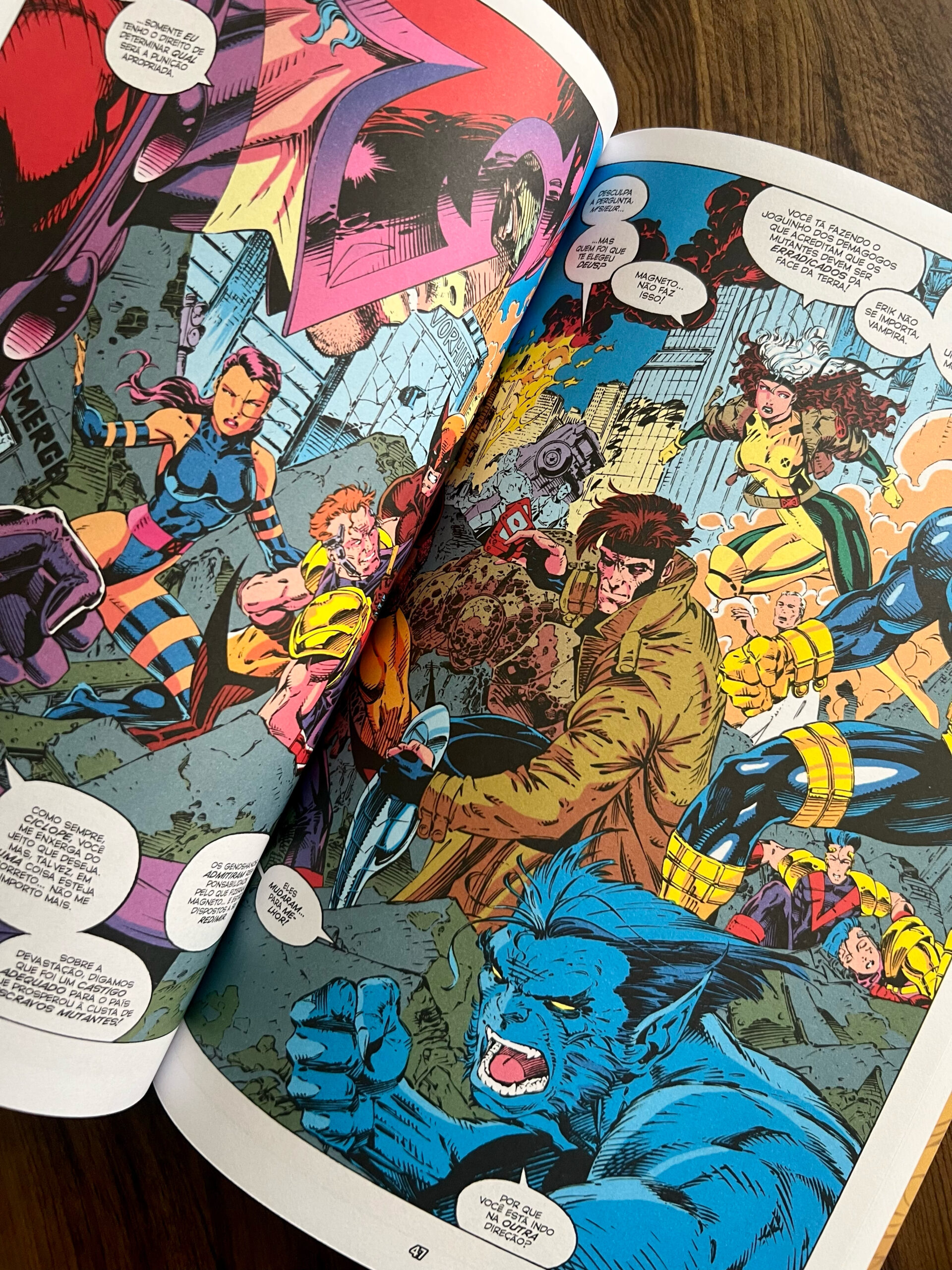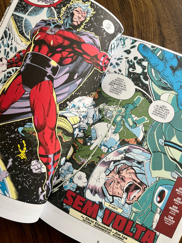 Outro aspecto positivo é que este volume encerra uma história completa, com o retorno de Magneto e a formação das novas equipes Azul e Dourada, já com os uniformes icônicos que marcaram época. Essa fase traz toda a nostalgia dos anos 90, período em que os novos desenhistas estavam em destaque, com páginas duplas, quadros grandes e um dinamismo impressionante.