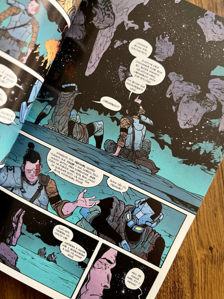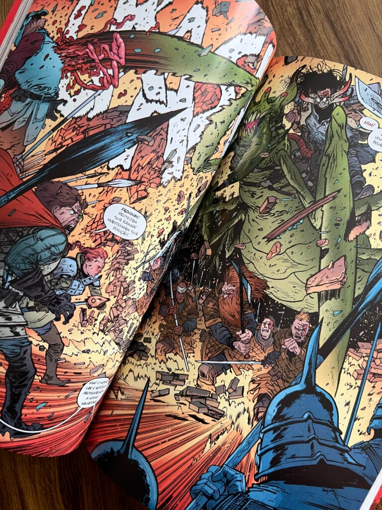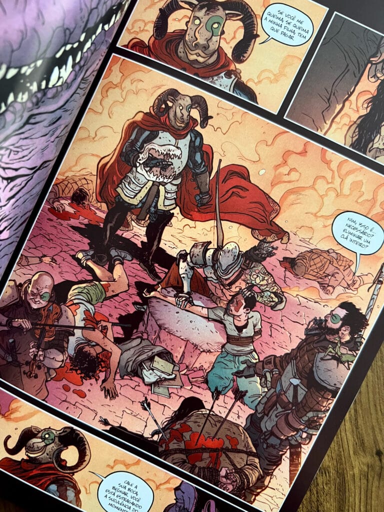 A arte de Daniel Warren Johnson é um dos grandes destaques de Extremity. Conhecido por seu traço expressivo e dinâmico, o autor cria um universo visualmente deslumbrante e entrega cenas de ação intensas e emocionantes. Em poucas páginas, o leitor já se vê imerso nesse mundo devastado pela guerra, repleto de ruínas, crenças e camadas de humanidade.