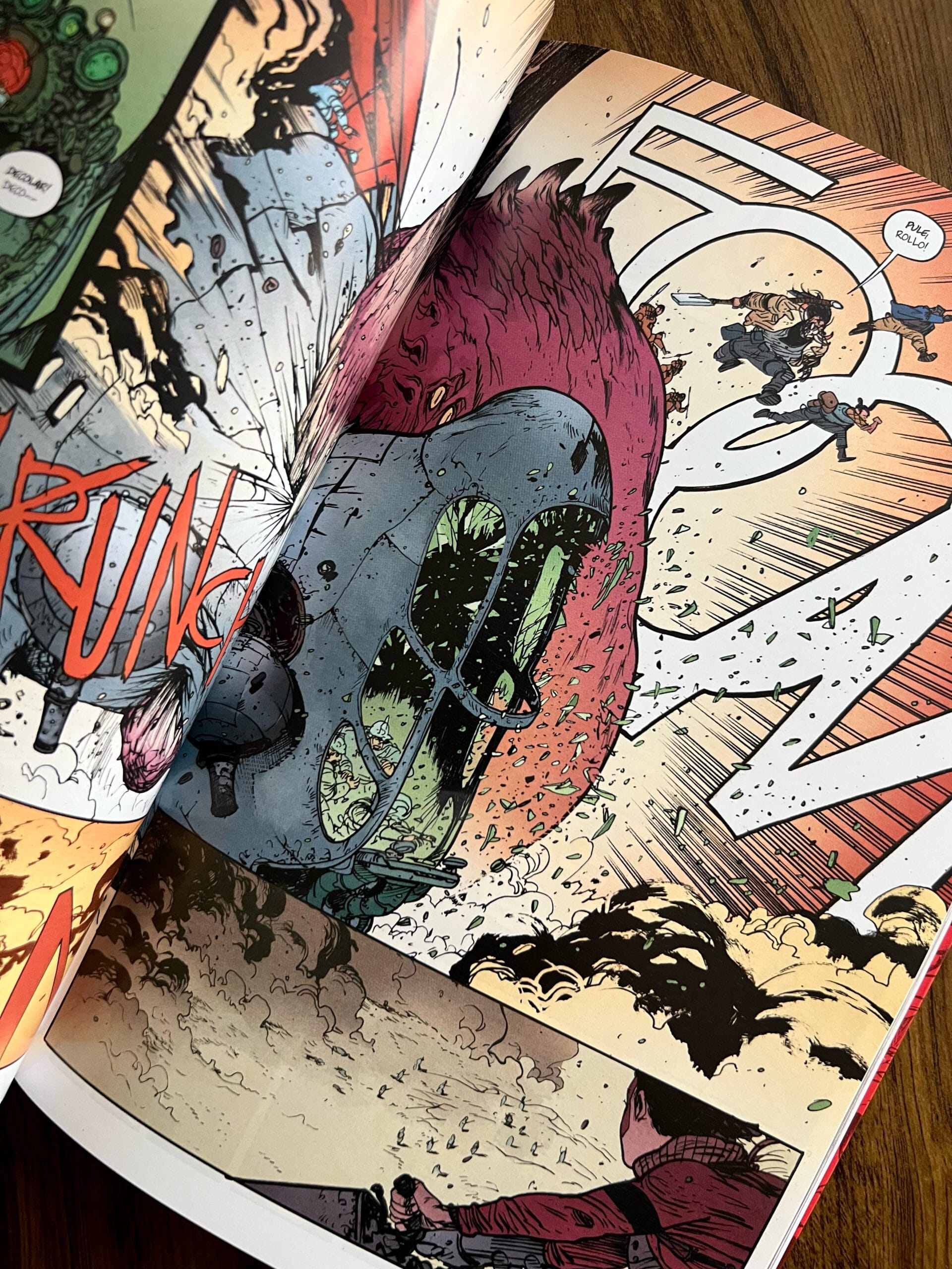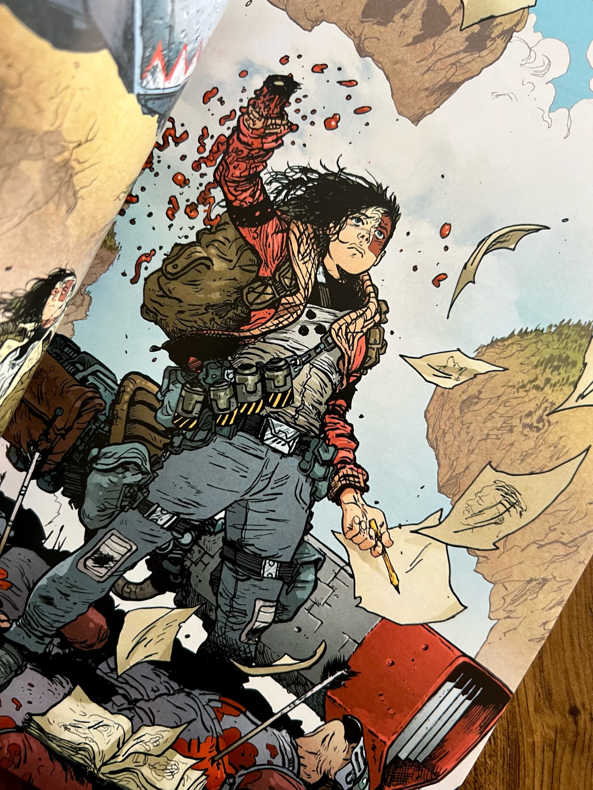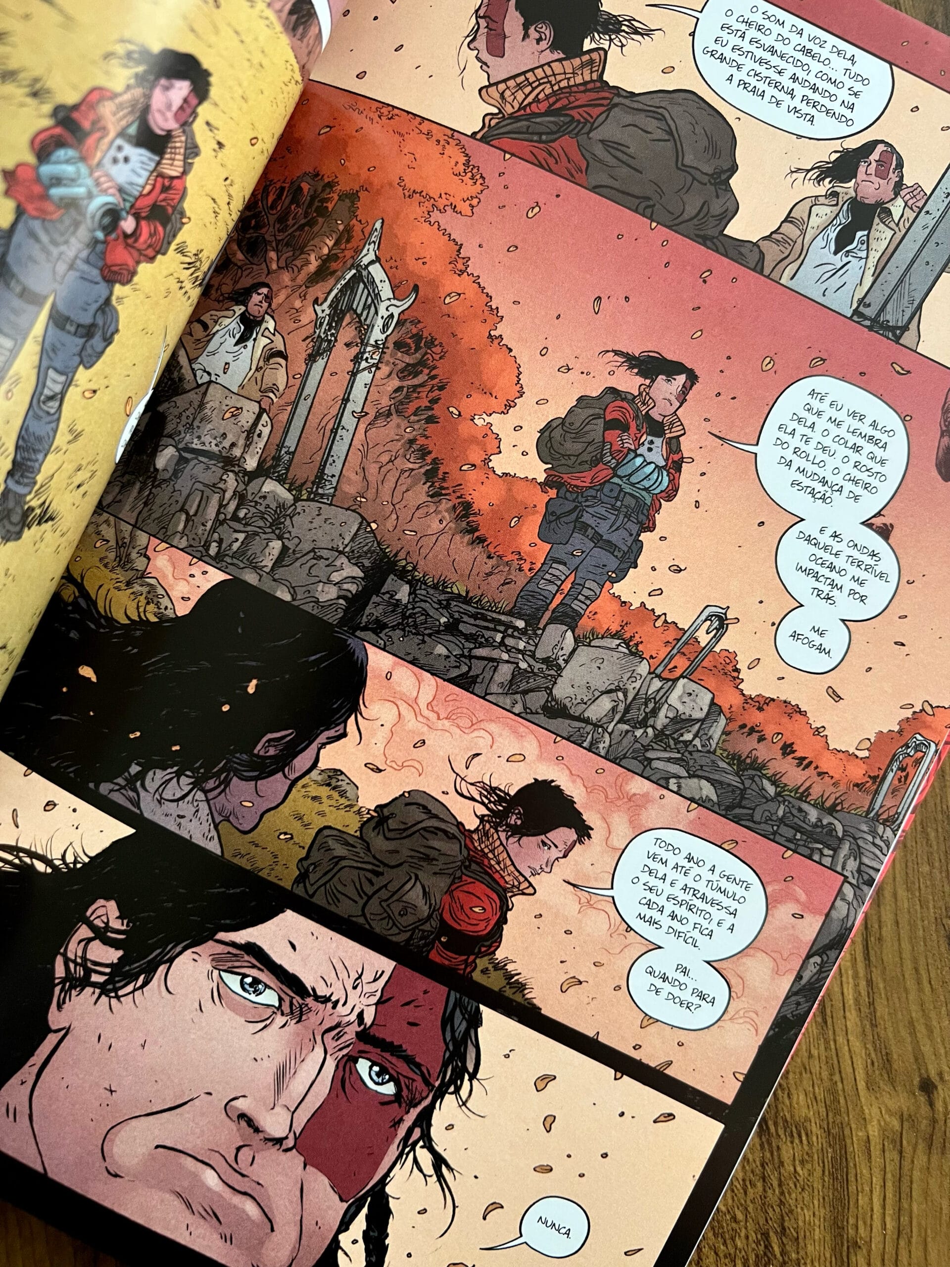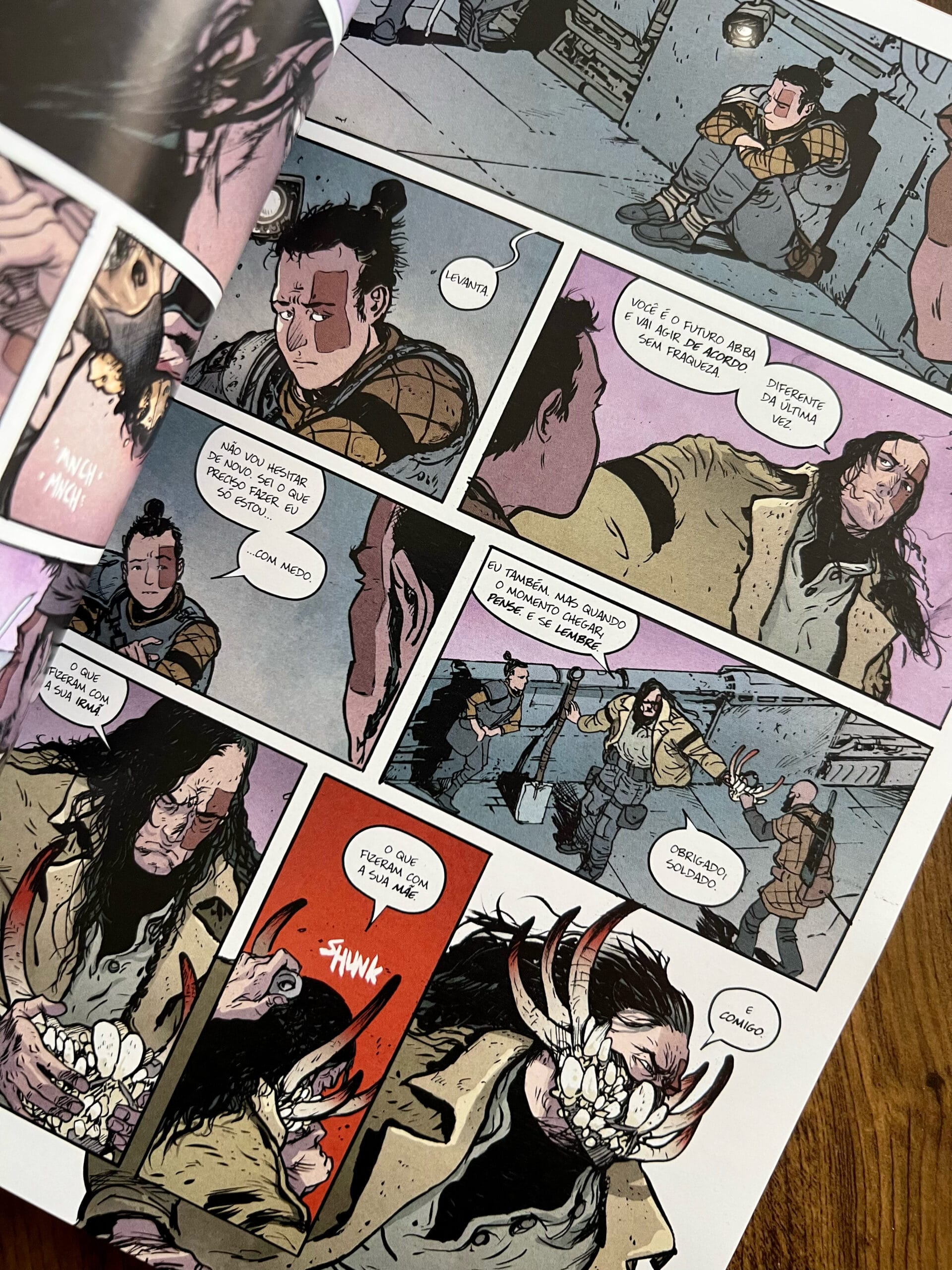 A arte de Daniel Warren Johnson é um dos grandes destaques de Extremity. Conhecido por seu traço expressivo e dinâmico, o autor cria um universo visualmente deslumbrante e entrega cenas de ação intensas e emocionantes. Em poucas páginas, o leitor já se vê imerso nesse mundo devastado pela guerra, repleto de ruínas, crenças e camadas de humanidade.
