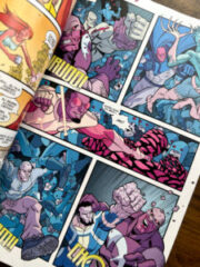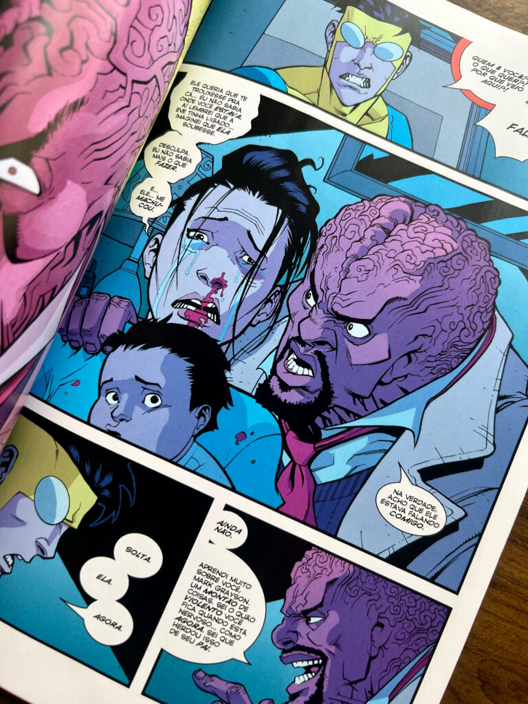 É também neste volume que ocorre um dos momentos mais emblemáticos da série: o retorno de Angstrom Levy. Diferente da adaptação animada, em que esse confronto acontece apenas ao final da segunda temporada, aqui o encontro épico entre Invencível e Levy ocorre mais cedo, em uma luta repleta de referências e piscadelas a outros universos, culminando em um desfecho brutal que transforma por completo a visão de mundo de Mark.