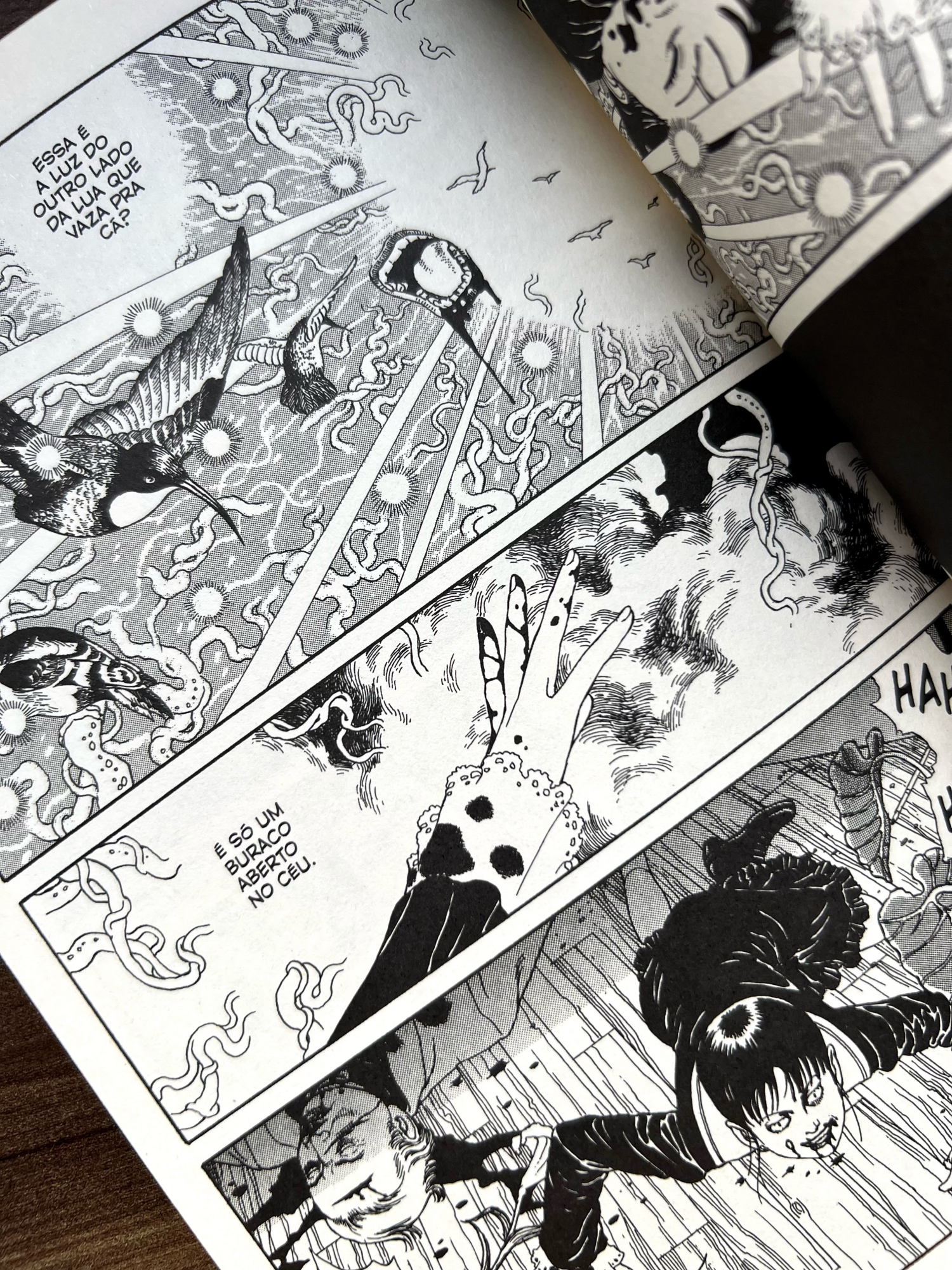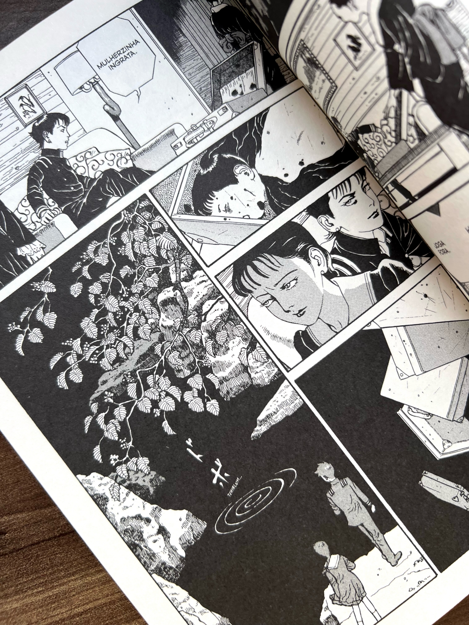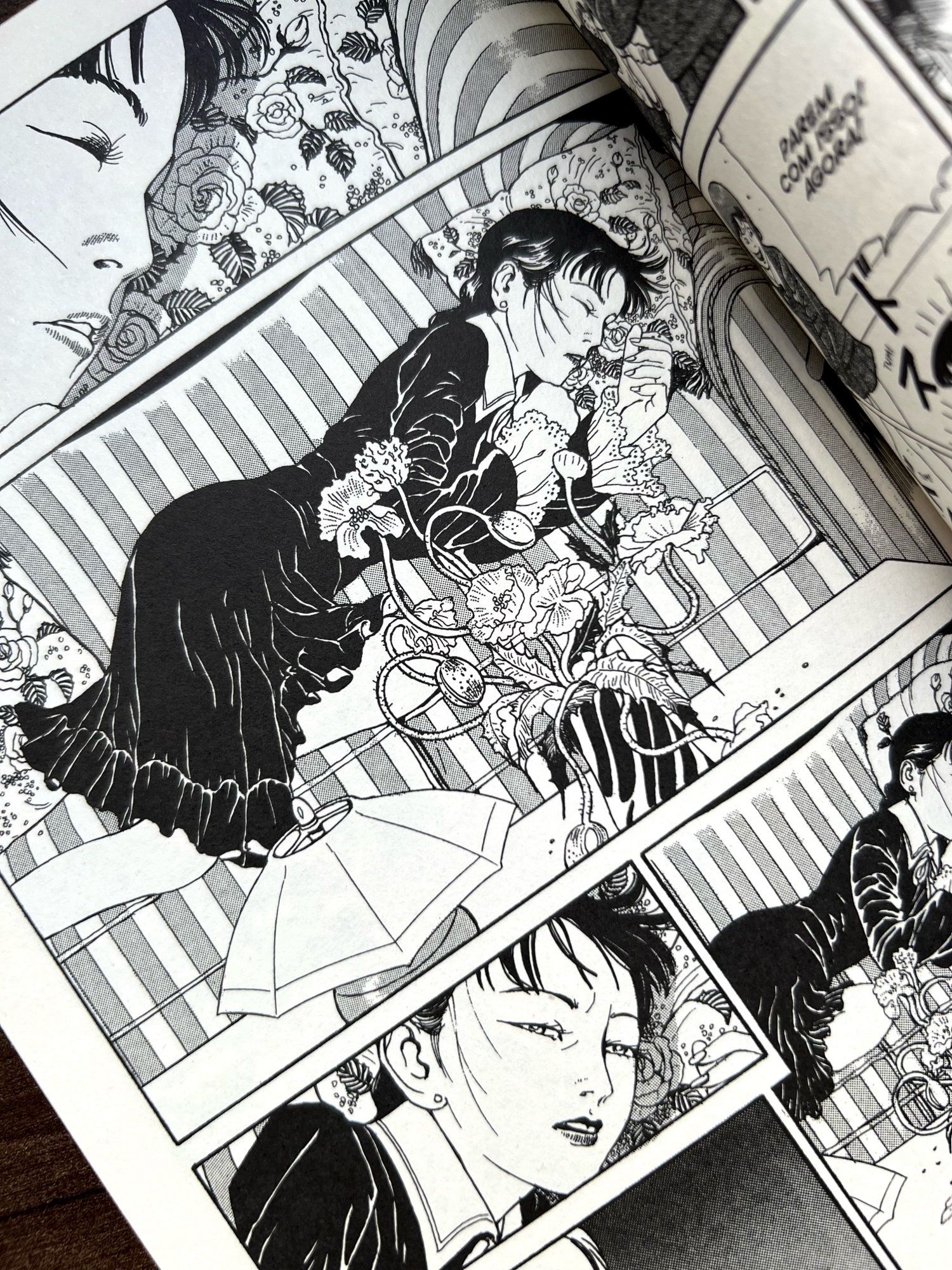 Apesar disso, a continuação escorrega em alguns momentos ao tentar conectar as duas tramas. Mesmo que existam similaridades entre elas, talvez faltasse um pouco mais de respiro para construir uma ligação mais orgânica e satisfatória. Por outro lado, a obra entrega um desfecho singular e desenvolve essa mistura de horror e fascínio de maneira que apenas Maruo consegue alcançar.