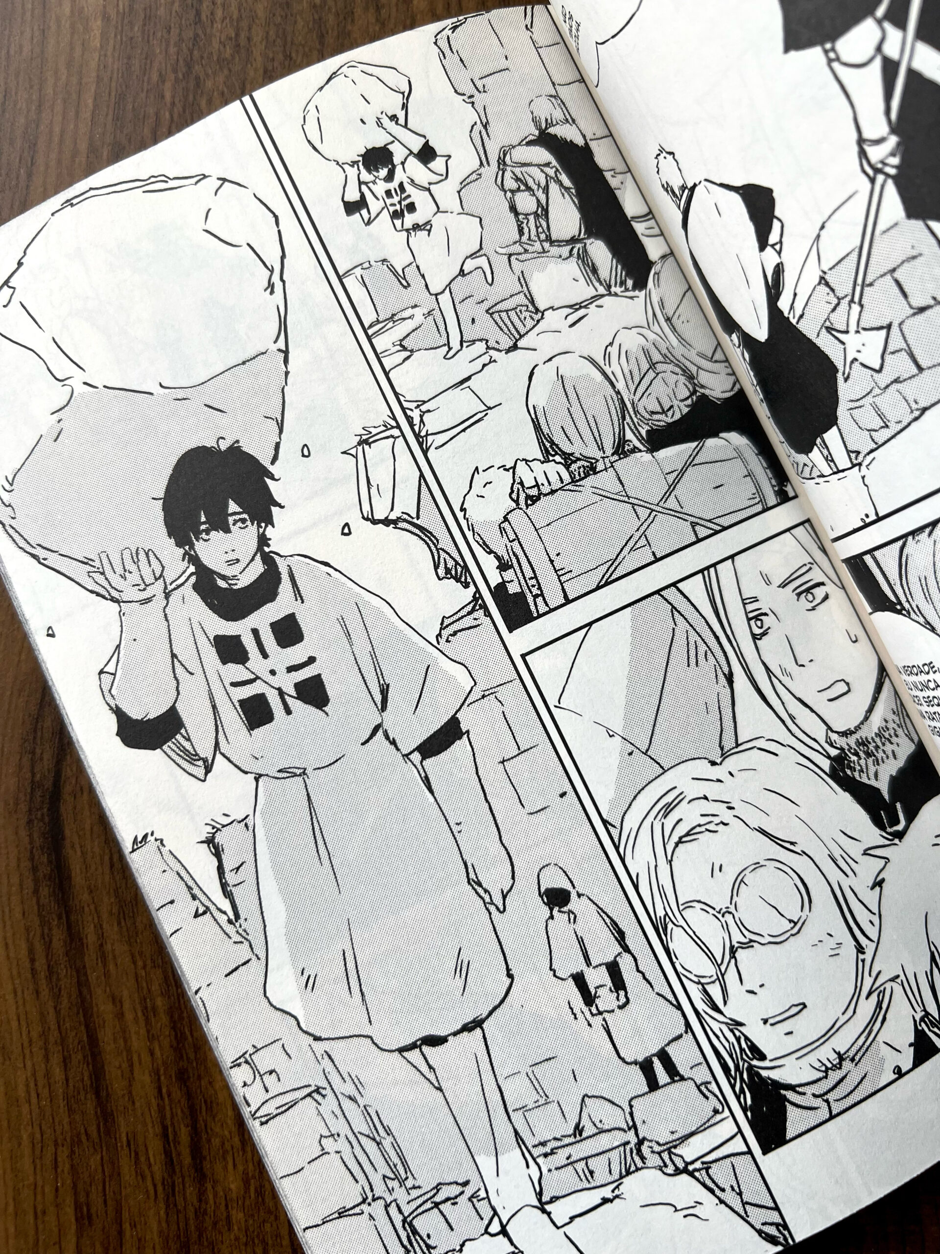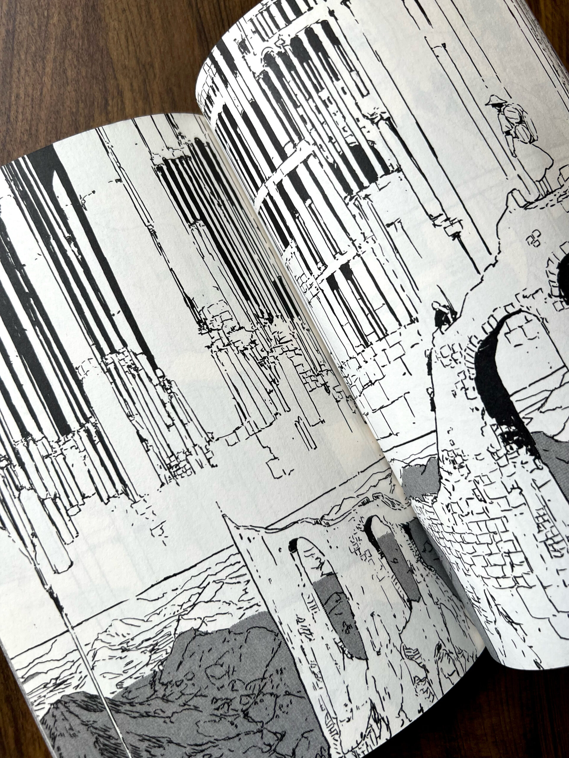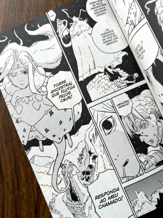 Sem sombra de dúvida, o maior ponto forte do mangá está em seus belíssimos cenários minimalistas e contemplativos, traçados com o estilo inconfundível de Nihei. A atmosfera sombria e misteriosa da torre, repleta de monstros gigantes e dragões, é hipnotizante — uma mistura entre o senso de aventura de Delicious in Dungeon e o tom enigmático e opressivo de Dark Souls. Cada página desperta o desejo de explorar mais e mais andares dessa imensa fortaleza que atravessa os céus.