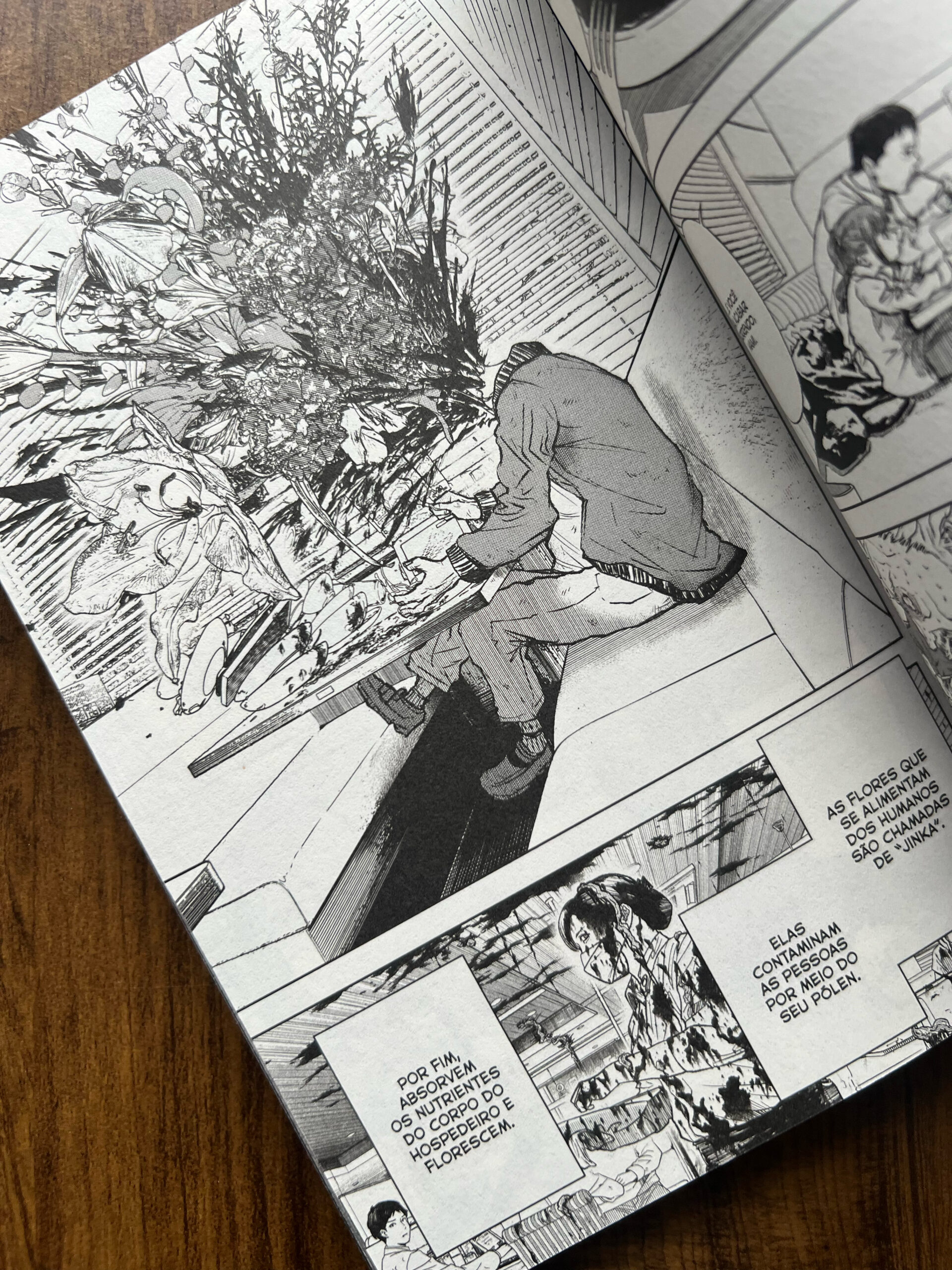 A arte de Ire Yonemoto é outro grande destaque da obra. O nível de detalhamento nos cenários, já nas primeiras páginas, é impressionante. Como cada prédio ou construção está completamente tomado por plantas, chama atenção a maneira como os Jinkas são desenhados, mesclando elementos botânicos com formas humanoides, assim como o design das armas feitas a partir dos próprios Jinkas. Tudo é extremamente minucioso — é possível identificar cada planta, raiz ou folha presente nas composições.