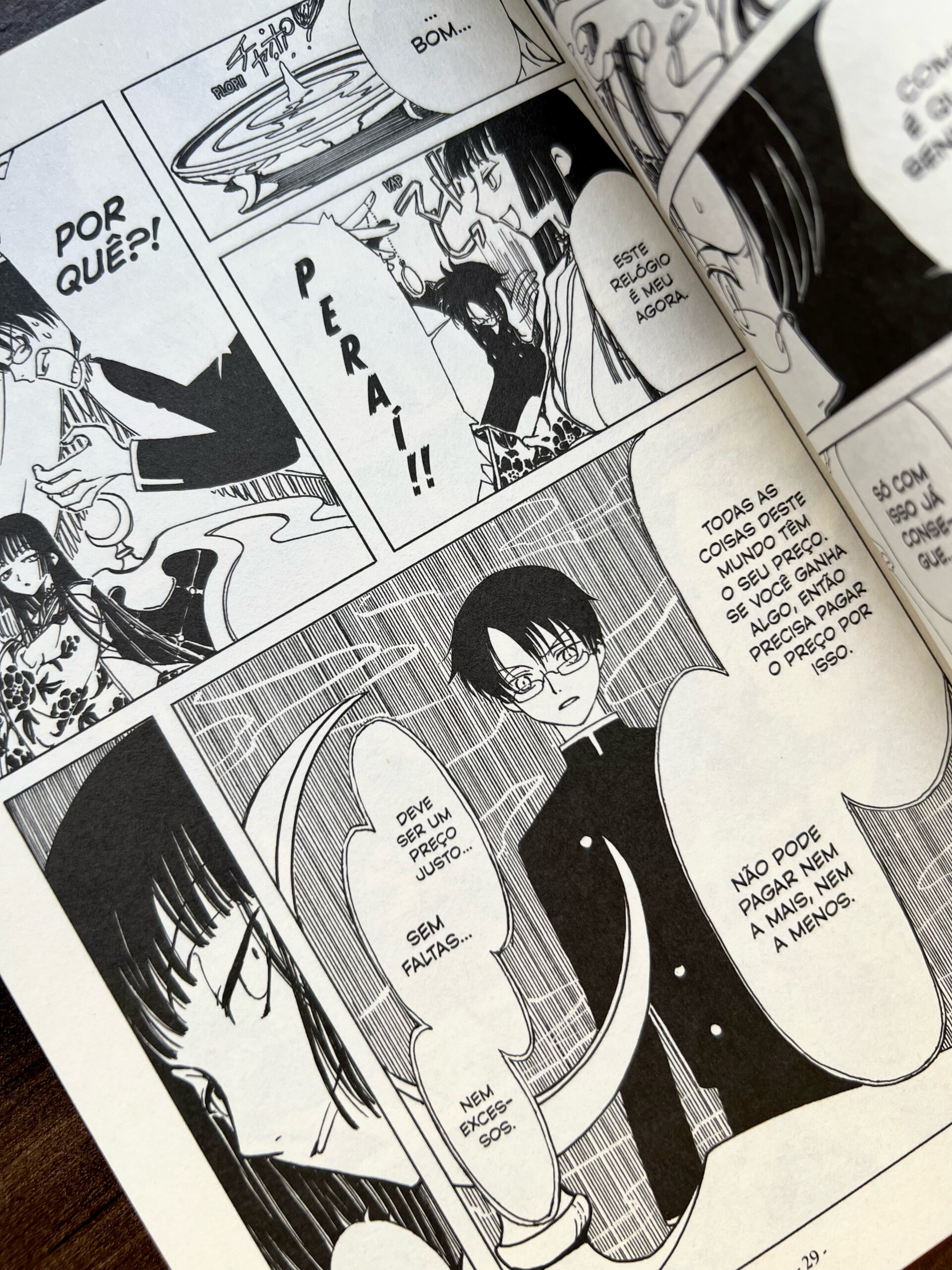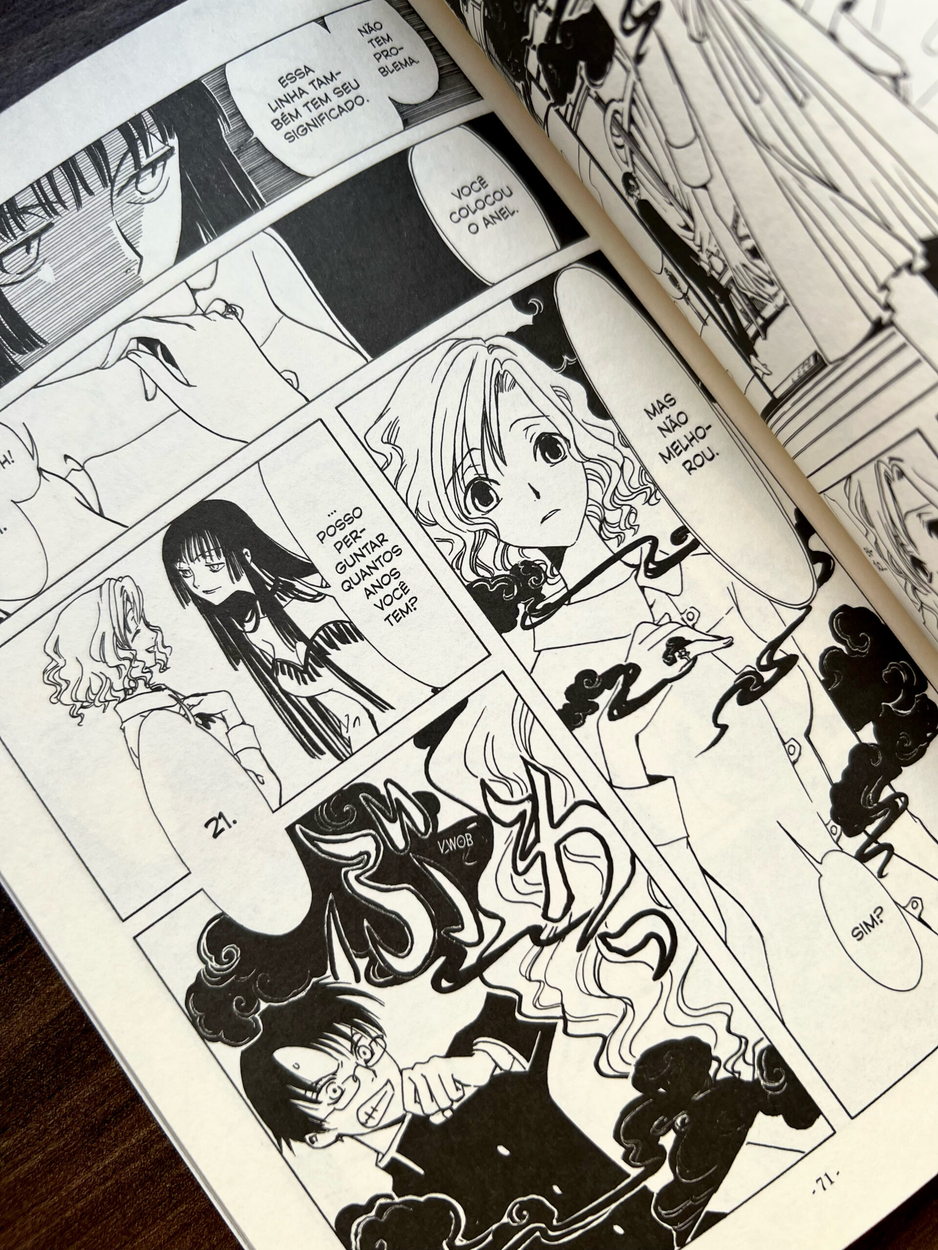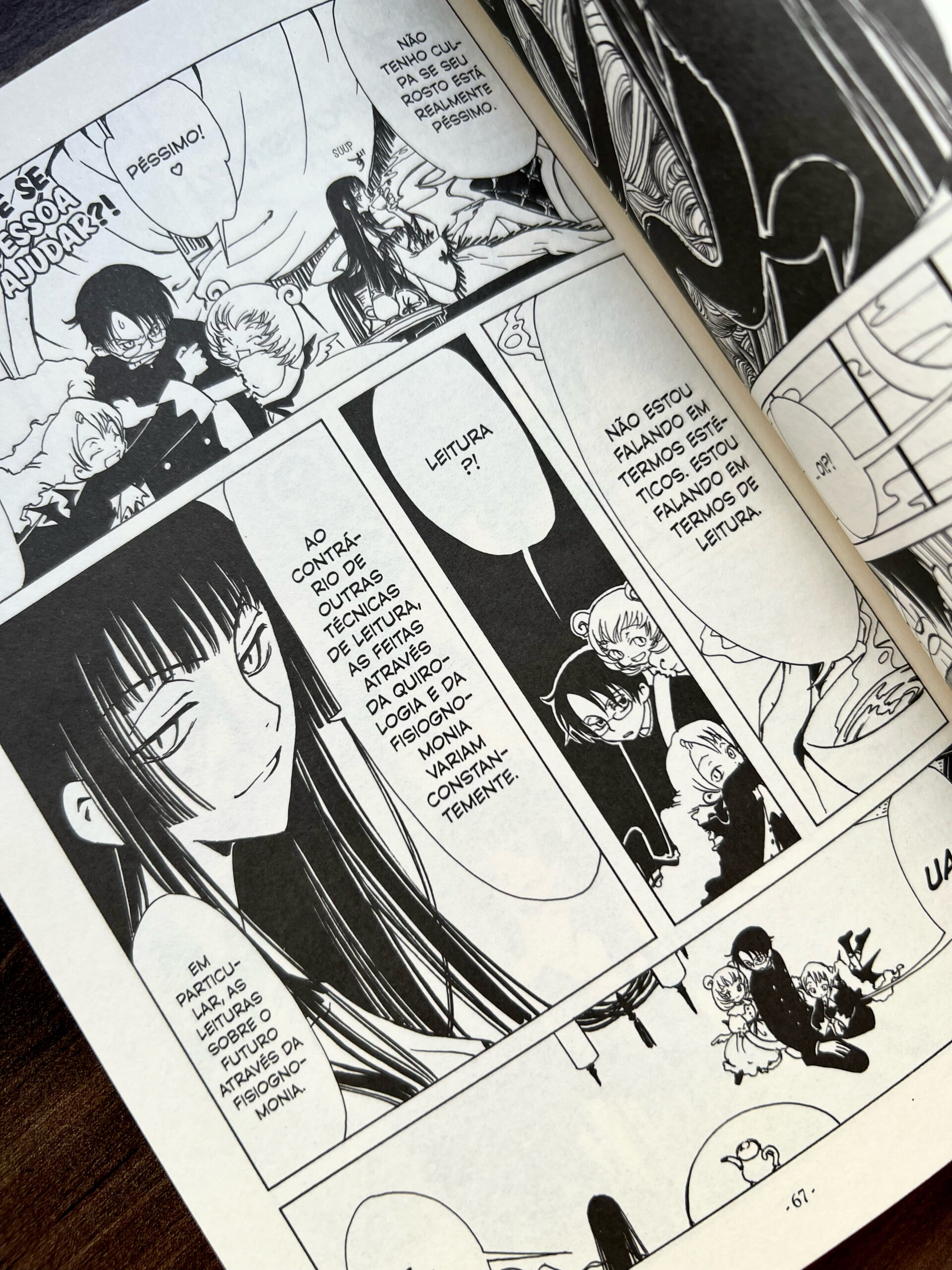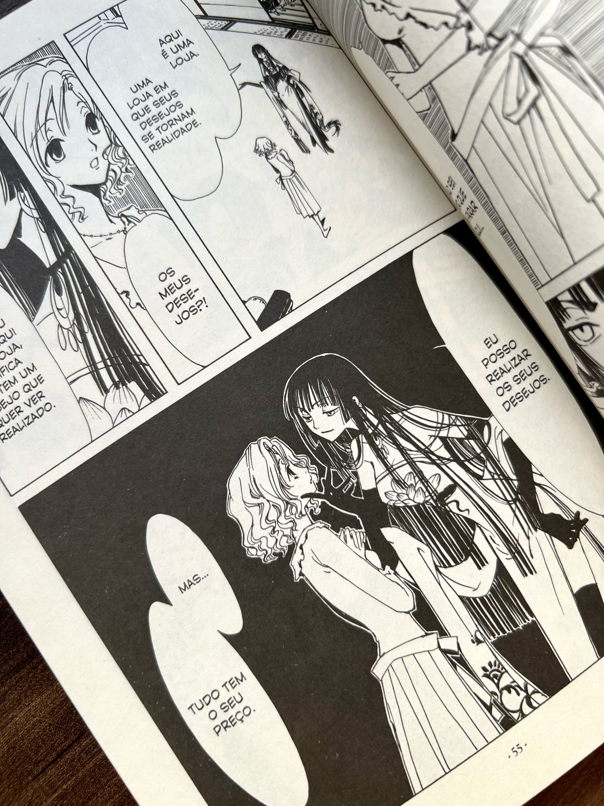 O primeiro volume de xxxHolic apresenta sua premissa de forma rápida e direta ao ponto. Em poucas páginas, somos introduzidos à trama principal, que fisga o leitor e desperta curiosidade imediata sobre seus desdobramentos. A narrativa também se destaca ao apresentar muito bem seus personagens, como o temperamental e impulsivo Watanuki e a misteriosa e sedutora Yuko, além dos assistentes Maru e Moro, criando uma dinâmica leve, divertida e envolvente.